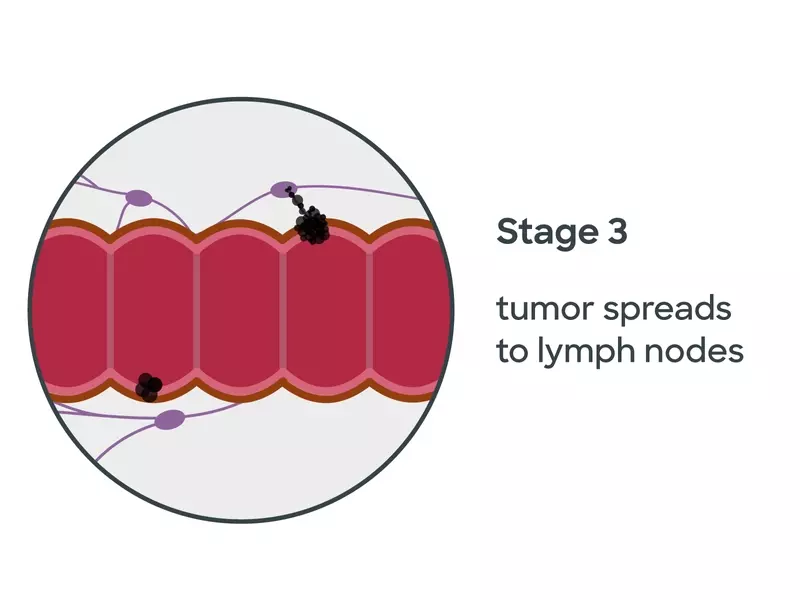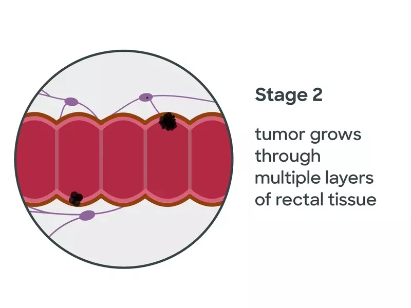 When rectal cancer progresses to stage 2, the cancerous cells have now invaded through multiple layers of rectal tissue into the fat surrounding the rectum and possibly into nearby tissues. Unlike later stages of the condition, cancer in stage 2 has not yet spread to any lymph nodes, including those near the tumor.